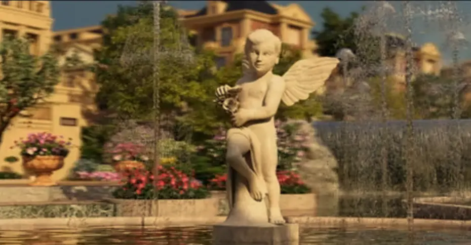 园中景观布局完全参照法式园林风格设计而成。古典而精致的欧式雕塑,丰富而考究的园艺摆放,处处透露着欧式浪漫主义气息,犹如将人们带回到充满艺术色彩的法式园林。壹码团队选取了高质量的动态树模型,使用Realflow制作出优美的水柱造型。